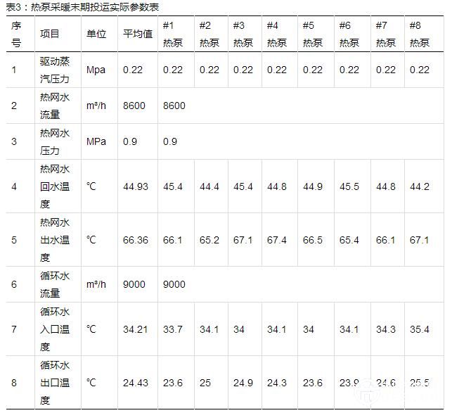 該工程共建設(shè)8臺35MW熱泵機組,2011下半年方案設(shè)計和可研,2012年5月設(shè)備招標(biāo),2014年1月投產(chǎn),實際節(jié)能效果還未進行熱力試驗評估,實際投產(chǎn)的運行參數(shù)見表3。