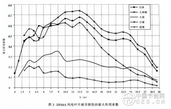 在葉尖施加揮舞、擺振和軸向三個方向的單位載荷.利用MSC.Patran軟件計算出葉片有限元模型各個截面的應(yīng)變值.引入Bladed軟件計算得m的疲勞載荷譜(即Markov矩陣)計算得到疲勞載荷作用下葉片各截面的應(yīng)變值.利用玻璃纖維復(fù)合材料疲勞損傷的計算理論.運(yùn)用自編的Mat—lab軟件計算并繪制出葉片各截面疲勞損傷的最大作用系數(shù)(見圖3)。