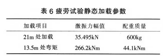 根據(jù)試驗規(guī)范的要求和該葉片疲勞危險截面的位置.以及減少疲勞試驗時間的目的.最終將葉片截斷為23m.并選撣疲勞試驗載荷的加載位置在葉片的21m截面.此時計算出的激振力靜態(tài)幅值和配重見表6所示.