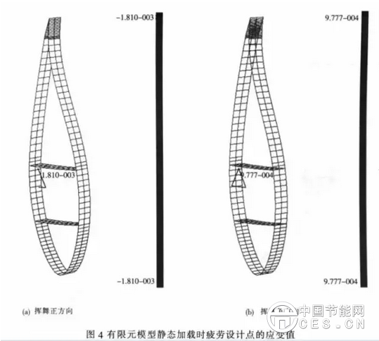 將上面計算得到的靜態(tài)數(shù)據(jù)與試驗有限元方法計算出的數(shù)據(jù)進(jìn)行對比.以確定利用上述理論計算的正確性。按揮舞正方向和揮舞負(fù)方向兩種T況.將上面得到的疲勞試驗靜態(tài)加載參數(shù)輸入到1.0MW葉片的有限元模型里進(jìn)行計算.則得到的疲勞載荷設(shè)計點(diǎn)的應(yīng)變值見圖4所示。