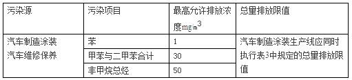 目前國(guó)家尚未專門對(duì)表面涂裝(汽車制造業(yè))及4S店噴漆廢氣排放制定相關(guān)標(biāo)準(zhǔn)(注:地方標(biāo)準(zhǔn),北京市出臺(tái)的《大氣污染綜合排放標(biāo)準(zhǔn)》對(duì)此有專門規(guī)定;廣東出臺(tái)了專門的地方標(biāo)準(zhǔn)DB44/816-2010),現(xiàn)行噴漆行業(yè)有機(jī)廢氣排放標(biāo)準(zhǔn)一般按如下標(biāo)準(zhǔn)執(zhí)行。