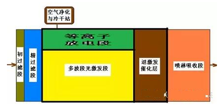 總工藝由過(guò)濾,等離子放電段,多波段光激發(fā)段,退激發(fā)與催化層,噴淋與吸收段組成。其中等離子放電段,多波段光激發(fā)段,退激發(fā)與催化層構(gòu)成本工藝的主工藝(ECB),氣體由過(guò)濾段進(jìn)入,經(jīng)噴淋吸收段排出。