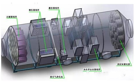 高能離子發(fā)生段通過(guò)“三交面”放電,產(chǎn)生大量中間態(tài)分子,例如臭氧、活性氧原子等。由于臭氧的擴(kuò)散系數(shù)很大,所以立即與廢氣混合,進(jìn)入多波段光激發(fā)段;該段由多種紫外線組成,以適應(yīng)各不同廢氣成分的共振吸收需求。各種廢氣成分,氧化成分在該段發(fā)生化學(xué)反應(yīng)并處于動(dòng)態(tài)過(guò)程中。退激發(fā)和催化層的核心是一種吸附劑,將各種被激發(fā)的活性物質(zhì)吸附并催化反應(yīng),變成低能態(tài)分子后,自動(dòng)解吸脫附。