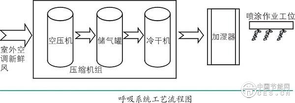 從室外空調(diào)取的新鮮風,將新鮮風送至多級渦旋式增壓壓縮機,產(chǎn)生的壓縮空氣由儲氣罐存儲保壓,再用空氣凈化器凈化處理,再經(jīng)過加濕、加溫調(diào)節(jié)及凈化綜合處理,最后通過衛(wèi)生級不銹鋼管道輸送到車間,供給噴漆工呼吸。