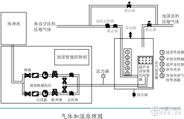 1)加濕原理及流程:在壓縮空氣管路中對氣體進行加濕,并可調(diào)。參考醫(yī)用加濕裝置,來自壓縮機的空氣管路分為2個支管,一支管通過純水加濕罐進行加濕,另一支管旁通通過;兩管路在加濕罐出口合并。各管路通過流量閥分別控制空氣流量,通過控制干燥、加濕的空氣流量從而控制管路中的空氣濕度。設計液位計及報警裝置,在加濕罐底部加裝一排水閥,可對罐中殘水進行定期更換與內(nèi)部清潔。桶裝純水凈水采用液位控制自動補加的方式,通過加裝電子檢測設備實現(xiàn)了液位可視、液位報警、濕度可調(diào)、有害氣體檢測功能。按照加濕設備的體積,每3—4個工位配一套的原則,壓縮空氣在進入加濕設備前加裝減壓閥,保證進入加濕設備的壓縮空氣壓力可調(diào)。加濕設備要有防止水流入空氣管路的裝置。