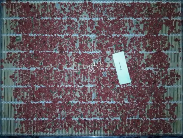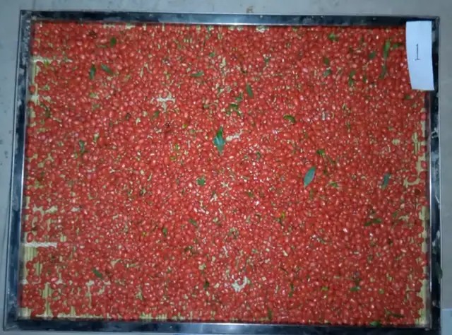 由于枸杞鮮果含水率80%左右,且枸杞果實(shí)有膠質(zhì)果皮,前期烘干不能太高溫度,需求分階段由35℃~65℃逐漸加溫,烘干時(shí)間比較長,大約需求24小時(shí),由高精度操控儀調(diào)節(jié)溫度和濕度。