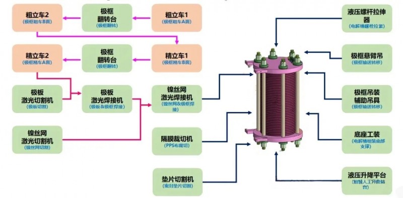 - 極板切制:使用激光切割機(jī)對(duì)極板進(jìn)行切割,確保尺寸和形狀的精確性。 - 隔膜裁切機(jī):使用隔膜裁切機(jī)對(duì)PPS布(聚苯硫醚布)進(jìn)行裁切,準(zhǔn)備用于電解槽的隔膜。 - 液壓升降平臺(tái):利用液壓升降平臺(tái)進(jìn)行人工升降,方便組裝電解槽。 - 液壓螺桿拉伸:使用液壓螺桿拉伸器將電解槽的螺栓拉緊,確保電解槽的密封性和穩(wěn)定性。 - 極框懸臂吊:用于極框的輸送和轉(zhuǎn)移,提高工作效率。