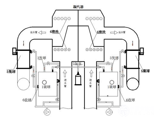 凝汽器真空保持系統(tǒng)與凝汽器冷卻水系統(tǒng)一同工作。其工藝流程為每隔30~60min清洗運(yùn)行一次,每次的清洗流程包括:壓縮空氣儲(chǔ)氣罐加壓,壓力釋放,發(fā)球裝置瞬間將膠球發(fā)射入凝汽器入口,數(shù)量眾多的膠球?qū)δ骼鋮s管進(jìn)行清洗,清洗過(guò)后,膠球通過(guò)回收裝置被收集回主體柜中的集球器,啟動(dòng)主體柜內(nèi)的膠球清潔程序,對(duì)膠球進(jìn)行清洗去污,隨后一次清洗流程結(jié)束。其工藝流程和設(shè)備簡(jiǎn)圖如下圖: