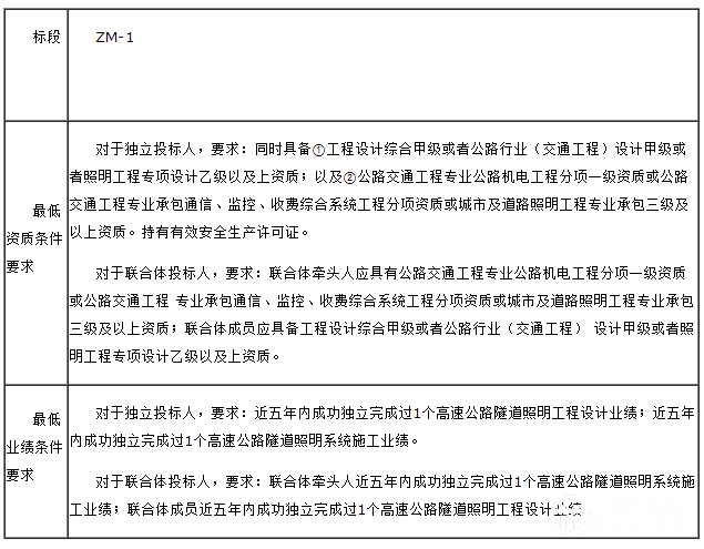3.2 本次招標(biāo)接收聯(lián)合體投標(biāo)。聯(lián)合體投標(biāo)的,應(yīng)滿足下列要求:組成聯(lián)合體的所有成員數(shù)量2個(gè), 聯(lián)合體牽頭人應(yīng)具有公路交通工程專業(yè)公路機(jī)電工程分項(xiàng)一級(jí)資質(zhì)或公路交通工程專業(yè)承包通信、監(jiān)控、收費(fèi)綜合系統(tǒng)工程分項(xiàng)資質(zhì)或城市及道路照明工程專業(yè)承包 三級(jí)及以上資質(zhì);聯(lián)合體成員應(yīng)具備工程設(shè)計(jì)綜合甲級(jí)或者公路行業(yè)(交通工程)設(shè)計(jì)甲級(jí)或者照明工程專項(xiàng)設(shè)計(jì)乙級(jí)以及上資質(zhì)。聯(lián)合體各方不得再以自己名義單 獨(dú)或參加其他聯(lián)合體在本項(xiàng)目同一標(biāo)段中投標(biāo),否則,相關(guān)投標(biāo)均將被否決。