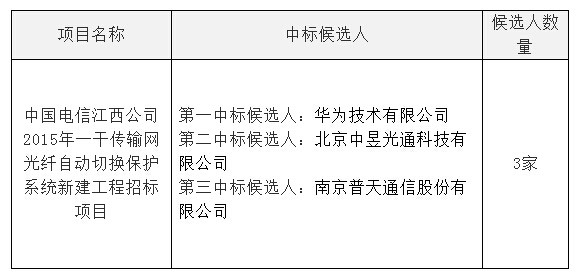 核心提示:昨天,官方公布中國(guó)電信江西公司2015年一干傳輸網(wǎng)光纖自動(dòng)切換保護(hù)系統(tǒng)新建工程招標(biāo)項(xiàng)目中標(biāo)候選人,其中,華為、北京中昱光通、南京普天分別