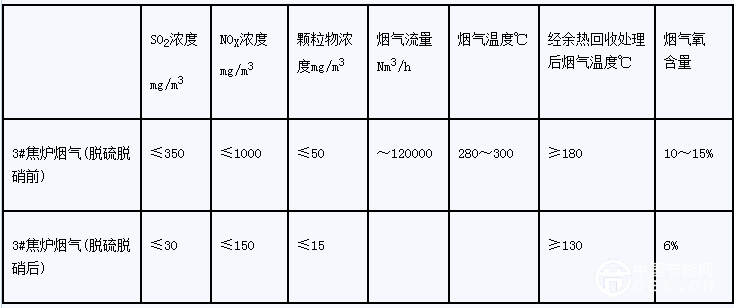 2.1項目概況:神華烏海能源西來峰煤化工分公司焦化廠西來峰焦化廠二期建設(shè)4×55孔JNDK55-05型搗固焦?fàn)t四座,2008年建設(shè),2009年10月-2010年1月四座焦?fàn)t陸續(xù)投產(chǎn),焦?fàn)t煤氣脫硫采用PDS氨法一塔式脫硫工藝,僅脫除焦?fàn)t煤氣中的硫化氫、氰化氫,煤氣中的硫醇、二硫化碳、硫醚等有機硫未脫除;脫氨采用噴淋式飽和器法;約50%左右的焦?fàn)t煤氣供焦?fàn)t加熱用,焦?fàn)t煤氣加熱后產(chǎn)生的廢氣經(jīng)余熱回收裝置后,煙氣溫度由280~300降至180℃左右,送至焦?fàn)t煙囪排放。煙氣中二氧化硫、氮氧化合物排放濃度不能滿足《煉焦化學(xué)工業(yè)污染物排放標(biāo)準(zhǔn)》(GB16171-2012)表6大氣污染物特別排放限值的要求,煙塵排放濃度不穩(wěn)定,亦有超標(biāo)現(xiàn)象發(fā)生。為徹底解決煙囪煙氣中二氧化硫、氮氧化合物不能達(dá)標(biāo)排放的問題,本次實施3#焦?fàn)t煙氣脫硫脫硝深度凈化示范項目。脫硝采用低溫SCR脫硝技術(shù),脫硫采用半干法脫硫除塵技術(shù)。脫硝裝置、余熱鍋爐、脫硝裝置的布置方式可在先脫硝然后余熱回收然后脫硫工藝、先脫硫再脫硝然后余熱回收工藝、先余熱回收再脫硫然后再脫硝工藝三種方式中任選一種,最終處理后煙氣溫度要保證在130℃以上,可送入原煙囪直接排放。