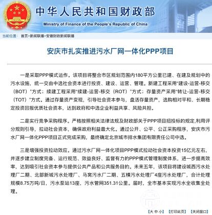 12月2日,作為財(cái)政部PPP示范項(xiàng)目的安徽省安慶市城區(qū)污水收集處理廠網(wǎng)一體化PPP項(xiàng)目完成招標(biāo)采購(gòu)。據(jù)悉該項(xiàng)目將整合安慶市區(qū)規(guī)劃范圍內(nèi)180平方公里已建、在建及規(guī)劃中的污水設(shè)施,統(tǒng)一交由中選社會(huì)資本進(jìn)行投資、建設(shè)、運(yùn)營(yíng)、管理,將通過污水廠網(wǎng)一體化項(xiàng)目PPP模式拉動(dòng)社會(huì)資本投資15億元左右,并逐步建立制度完備、運(yùn)行規(guī)范、效益良好、監(jiān)督有力的PPP模式管理制度體系,進(jìn)一步提高效率,達(dá)到吸引社會(huì)資本參與提供公共產(chǎn)品和公共服務(wù)目的;由此推進(jìn)城區(qū)存量污水處理設(shè)施的統(tǒng)一運(yùn)營(yíng)管理、增量污水處理設(shè)施的統(tǒng)籌規(guī)劃建設(shè),實(shí)現(xiàn)污水全收集、全處理的目標(biāo),也對(duì)PPP在市政公共服務(wù)領(lǐng)域中繼續(xù)推進(jìn)具有重要參考價(jià)值。