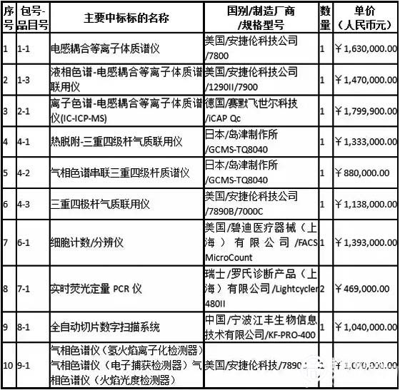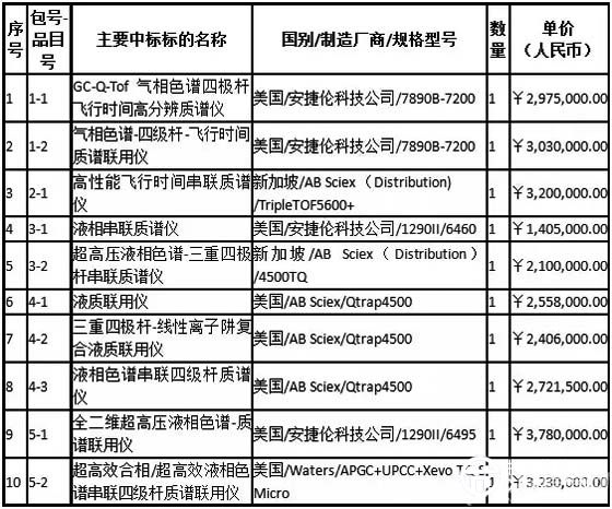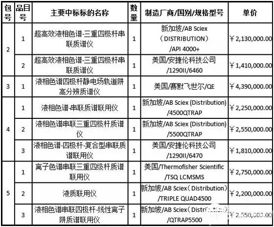 2015年12月31日,中國政府采購網(wǎng)公布了一系列國家質(zhì)檢總局對2015年提升食品質(zhì)量安全檢(監(jiān))測能力建設專項120萬元以上儀器設備采購項目中標結(jié)果。本次中標結(jié)果涉及25套質(zhì)譜聯(lián)用儀以及氣相色譜儀、PCR等,中標總金額超出6100萬元,安捷倫、賽默飛、島津、SCIEX、Waters等進口品牌紛紛中標。