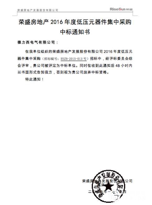 阿德再次祝賀德力西電氣成榮盛房地產(chǎn)2016年度低壓元器件中標企業(yè)!此次與榮盛房地產(chǎn)的強強合作,相信日后定會為彼此的發(fā)展開創(chuàng)新的輝煌篇章。德家一定會再接再厲,三十年如一日,時刻守護您的用電安全。