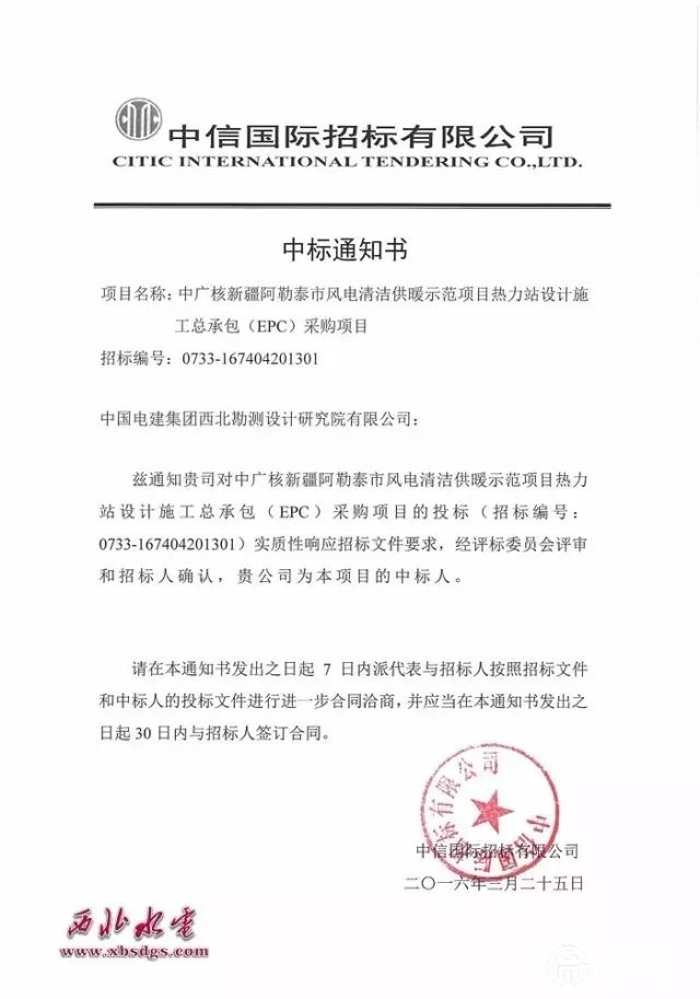 3月25日,西北水電公司收到招標(biāo)代理機(jī)構(gòu)發(fā)來(lái)的中標(biāo)通知書(shū),宣布西北水電中標(biāo)中廣核新疆阿勒泰市風(fēng)電清潔供暖示范項(xiàng)目熱力站設(shè)計(jì)施工總承包(EPC)采購(gòu)項(xiàng)目。
