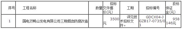 招標(biāo)范圍為國(guó)電雙鴨山發(fā)電有限公司三期煙囪防腐改造。具體內(nèi)容詳見招標(biāo)文件第二卷的有關(guān)規(guī)定。