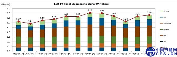 根據(jù)IHS DisplaySearch最新的月度LCD市場動態(tài)報(bào)告調(diào)查顯示,2014年12月出貨至中國廠商液晶電視面板數(shù)量與前一個月略微下降1%,低于預(yù)期5個百分點(diǎn)。群創(chuàng)依然為中國大陸廠商最大面板供應(yīng)商,緊隨其后為LG Display和華星。由于中國廠商對液晶電視面板的強(qiáng)勁需求,2014年全年液晶電視面板采購量大幅增長21%。