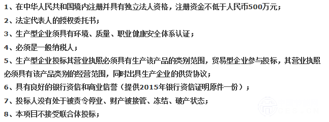 6.3 資格審查:采用資格后審。招標(biāo)人在報(bào)名時(shí)只對(duì)潛在投標(biāo)人的資質(zhì)進(jìn)行審查。潛在投標(biāo)人報(bào)名時(shí)應(yīng)攜帶:①有效的法人營業(yè)執(zhí)照副本;②有效的組織機(jī)構(gòu)代碼證書副本;③稅務(wù)登記證;④法人代表授權(quán)委托書原件;授權(quán)代理人身份證原件及復(fù)印件;⑤三標(biāo)體系認(rèn)證證書;⑥如果貿(mào)易型企業(yè)參與投標(biāo),應(yīng)提供生產(chǎn)企業(yè)的供貨協(xié)議。