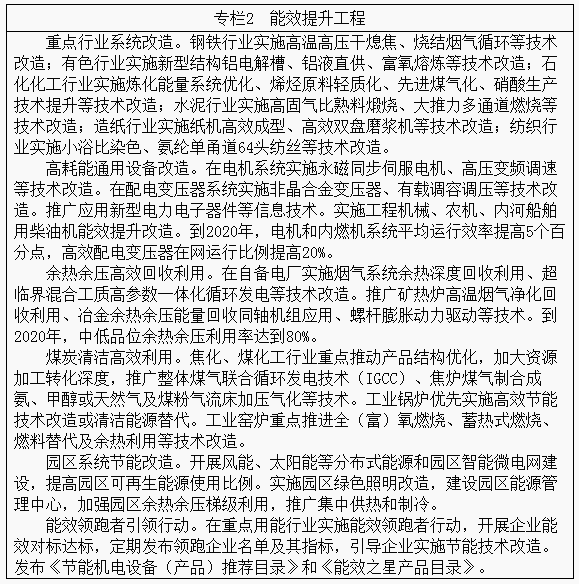 以先進(jìn)適用技術(shù)裝備應(yīng)用為手段,強(qiáng)化技術(shù)節(jié)能。全面推進(jìn)傳統(tǒng)行業(yè)節(jié)能技術(shù)改造,深入推進(jìn)重點(diǎn)行業(yè)、重點(diǎn)企業(yè)能效提升專(zhuān)項(xiàng)行動(dòng),加快推廣高溫高壓干熄焦、無(wú)球化粉磨、新型結(jié)構(gòu)鋁電解槽、智能控制等先進(jìn)技術(shù)。繼續(xù)推進(jìn)鍋爐、電機(jī)、變壓器等通用設(shè)備能效提升工程,組織實(shí)施空壓機(jī)系統(tǒng)能效提升計(jì)劃。圍繞高耗能行業(yè)企業(yè),加快工藝革新,實(shí)施系統(tǒng)節(jié)能改造,鼓勵(lì)先進(jìn)節(jié)能技術(shù)的集成優(yōu)化運(yùn)用,推廣電爐鋼等短流程工藝和鋁液直供,推動(dòng)工業(yè)節(jié)能從局部、單體節(jié)能向全流程、系統(tǒng)節(jié)能轉(zhuǎn)變。提升產(chǎn)品的輕量化水平,推廣復(fù)合材料、輕合金、真空鍍鋁紙等高強(qiáng)韌度新型材料,推廣超高強(qiáng)度鋼熱沖壓成形技術(shù)、真空高壓鑄造、超高真空薄壁鑄造等輕量化成形工藝。普及中低品位余熱余壓發(fā)電、供熱及循環(huán)利用,積極推進(jìn)利用鋼鐵、化工等行業(yè)企業(yè)的低品位余熱向城市居民供熱,促進(jìn)產(chǎn)城融合。實(shí)施工業(yè)園區(qū)節(jié)能改造工程,加強(qiáng)園區(qū)能源梯級(jí)利用,推進(jìn)集中供熱制冷。