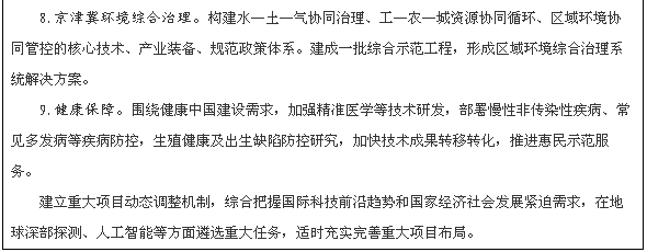 面向2030年,再選擇一批體現(xiàn)國家戰(zhàn)略意圖的重大科技項目,力爭有所突破。從更長遠(yuǎn)的戰(zhàn)略需求出發(fā),堅持有所為、有所不為,力爭在航空發(fā)動機及燃?xì)廨啓C、深??臻g站、量子通信與量子計算、腦科學(xué)與類腦研究、國家網(wǎng)絡(luò)空間安全、深空探測及空間飛行器在軌服務(wù)與維護系統(tǒng)、種業(yè)自主創(chuàng)新、煤炭清潔高效利用、智能電網(wǎng)、天地一體化信息網(wǎng)絡(luò)、大數(shù)據(jù)、智能制造和機器人、重點新材料研發(fā)及應(yīng)用、京津冀環(huán)境綜合治理、健康保障等重點方向率先突破。按照“成熟一項、啟動一項”的原則,分批次有序啟動實施。