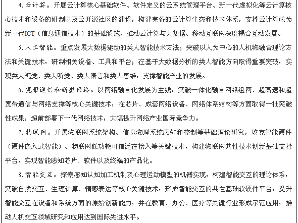 大力發(fā)展泛在融合、綠色寬帶、安全智能的新一代信息技術(shù),研發(fā)新一代互聯(lián)網(wǎng)技術(shù),保障網(wǎng)絡(luò)空間安全,促進(jìn)信息技術(shù)向各行業(yè)廣泛滲透與深度融合。發(fā)展先進(jìn)計算技術(shù),重點加強E級(百億億次級)計算、云計算、量子計算、人本計算、異構(gòu)計算、智能計算、機器學(xué)習(xí)等技術(shù)研發(fā)及應(yīng)用;發(fā)展網(wǎng)絡(luò)與通信技術(shù),重點加強一體化融合網(wǎng)絡(luò)、軟件定義網(wǎng)絡(luò)/網(wǎng)絡(luò)功能虛擬化、超高速超大容量超長距離光通信、無線移動通信、太赫茲通信、可見光通信等技術(shù)研發(fā)及應(yīng)用;發(fā)展自然人機交互技術(shù),重點是智能感知與認(rèn)知、虛實融合與自然交互、語義理解和智慧決策、云端融合交互和可穿戴等技術(shù)研發(fā)及應(yīng)用。發(fā)展微電子和光電子技術(shù),重點加強極低功耗芯片、新型傳感器、第三代半導(dǎo)體芯片和硅基光電子、混合光電子、微波光電子等技術(shù)與器件的研發(fā)。