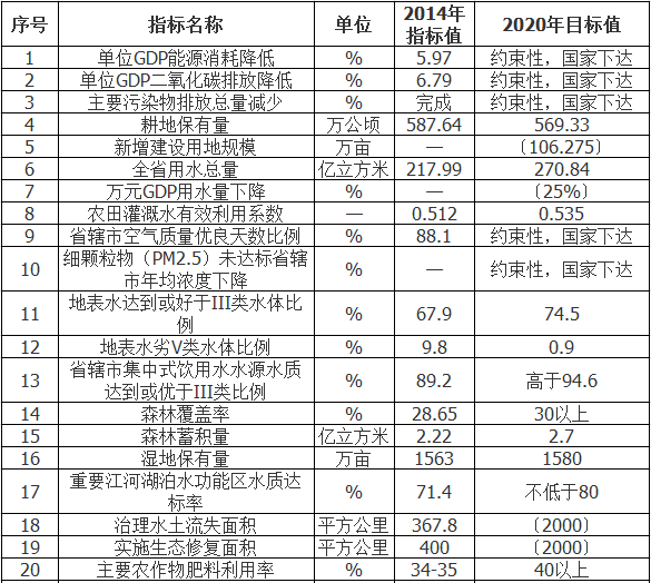 ——生態(tài)環(huán)境質(zhì)量總體改善。全面完成國家下達(dá)的主要污染物減排任務(wù),全省空氣質(zhì)量明顯改善,基本消除重污染天氣。重要江河湖泊水功能區(qū)水質(zhì)達(dá)標(biāo)率不低于80%,省轄市集中式飲用水水源水質(zhì)達(dá)到或優(yōu)于Ⅲ類比例高于94.6%。土壤環(huán)境質(zhì)量總體保持穩(wěn)定。森林覆蓋率達(dá)到30%以上,林木綠化率達(dá)到35%,濕地保有量達(dá)到1580萬畝,生態(tài)系統(tǒng)穩(wěn)定性明顯增強(qiáng),生態(tài)安全保障能力進(jìn)一步提升。