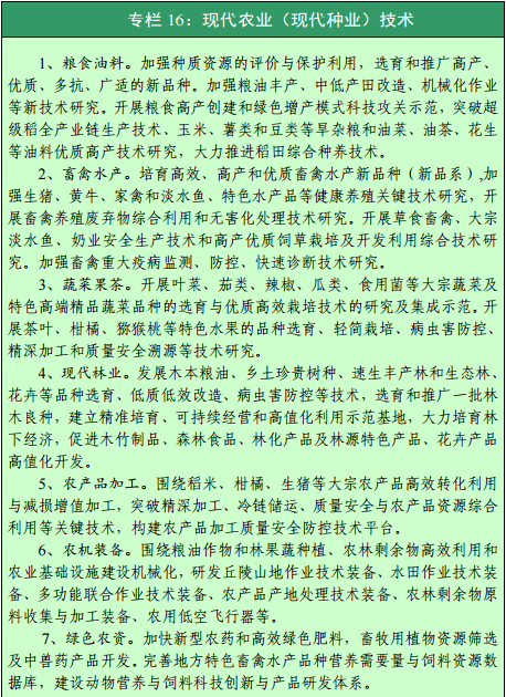 落實藏糧于技戰(zhàn)略,以“高產(chǎn)、優(yōu)質、高效、生態(tài)、安全”為目標,突破生物育種、產(chǎn)地凈化、綠色防控、農(nóng)業(yè)裝備、生態(tài)種養(yǎng)、冷鏈貯運、精深加工等全產(chǎn)業(yè)鏈技術,推動傳統(tǒng)農(nóng)業(yè)向專業(yè)化、品牌化和全鏈條增值轉變。推進超級稻等重大科研攻關,加強國家糧食安全和高效經(jīng)作產(chǎn)業(yè)發(fā)展科技創(chuàng)新保障能力。推廣“互聯(lián)網(wǎng)+農(nóng)業(yè)”發(fā)展模式,推動農(nóng)村一二三產(chǎn)業(yè)融合發(fā)展,培育休閑農(nóng)業(yè)、旅游農(nóng)業(yè)、創(chuàng)意農(nóng)業(yè)等新業(yè)態(tài)。