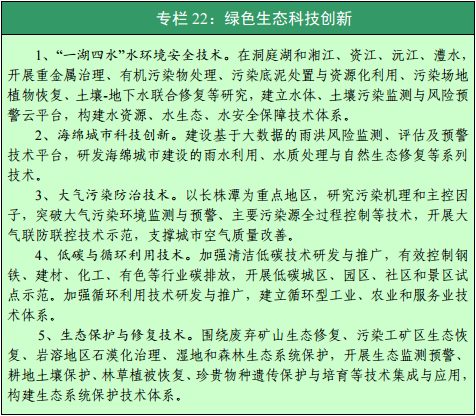 開展環(huán)境污染治理、生態(tài)建設、環(huán)境監(jiān)測和保護等技術研究,推動從末端治理向全過程綜合防控轉變。實施“一湖四水”水環(huán)境安全科技創(chuàng)新工程,構建源頭減排、資源利用、過程控制、深度治理與修復的技術體系。加快大氣污染治理技術研發(fā)與應用,建立重污染天氣監(jiān)測預警體系及質控標準。加強清潔低碳與循環(huán)利用技術研發(fā)與示范推廣,建設科技創(chuàng)新示范基地。加強農(nóng)業(yè)面源污染防治技術研發(fā)與推廣應用,提升農(nóng)業(yè)可持續(xù)發(fā)展支撐能力。
