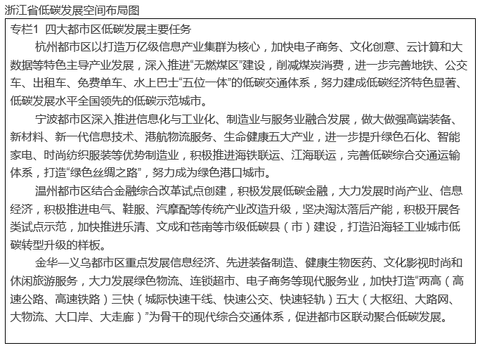 根據(jù)杭州、寧波、溫州和金華—義烏四大都市區(qū)和七個省域中心城市的城鎮(zhèn)空間布局和功能等級,加快推動城鎮(zhèn)化與低碳化深度融合,提升資源要素配置效率,努力在空間布局優(yōu)化、產(chǎn)業(yè)協(xié)同發(fā)展、生態(tài)環(huán)境共保、公共服務(wù)共享等方面取得實質(zhì)性進展。