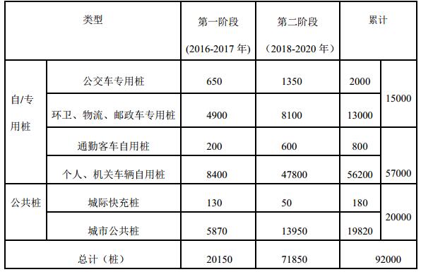2016-2017 年,計(jì)劃建設(shè)公交、環(huán)衛(wèi)、物流、郵政等車輛專用樁超過 5500 個(gè),企業(yè)、機(jī)關(guān)和個(gè)人車輛自用樁超過 8600 個(gè),建設(shè)公共充電樁超過 6000 個(gè); 2018-2020 年加強(qiáng)充電基礎(chǔ)設(shè)施建設(shè)力度,計(jì)劃建設(shè)公交、環(huán)衛(wèi)、物流、郵政等車輛專用樁超過 9400 個(gè),機(jī)關(guān)和個(gè)人車輛自用樁超過 4.8 萬個(gè),建設(shè)公共充電樁超過 1.4 萬個(gè),集中力量完成總體目標(biāo)。