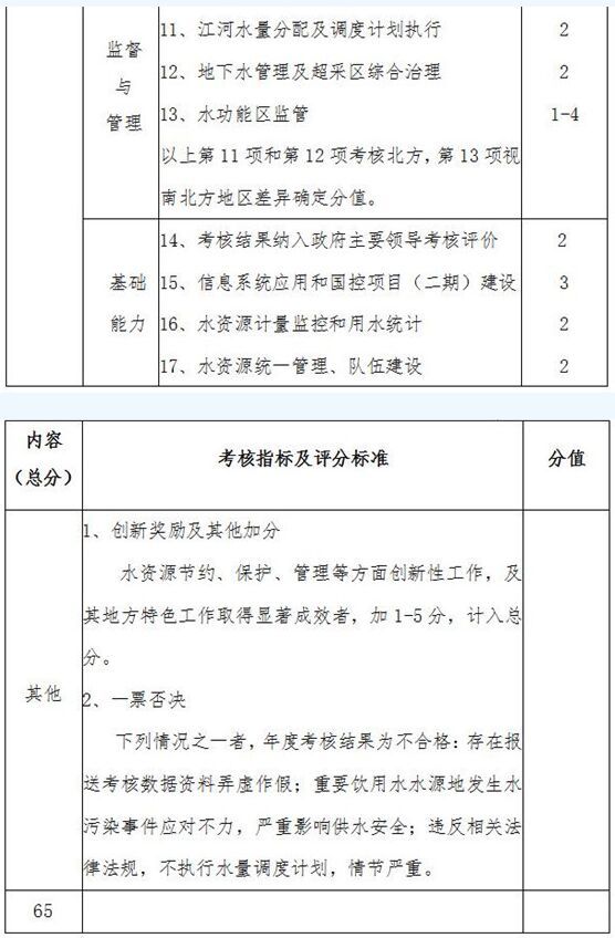 目標完成情況分值35分,評分內(nèi)容包括用水總量控制目標、用水效率控制目標、水功能區(qū)限制納污目標3類目標6項指標,其中用水總量控制目標的用水總量指標分值為10分,用水效率控制目標的萬元國內(nèi)生產(chǎn)總值用水量降幅指標、萬元工業(yè)增加值用水量降幅指標和農(nóng)田灌溉水有效利用系數(shù)指標分值為10分(南方)/15分(北方),水功能區(qū)限制納污目標的重要水功能區(qū)水質(zhì)達標率指標和重要水功能區(qū)污染物總量減排量指標分值為15分(南方)/10分(北方)。相關數(shù)據(jù)由地方人民政府負責提供。