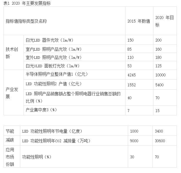 到2020年, 我國(guó)半導(dǎo)體照明關(guān)鍵技術(shù)不斷突破,產(chǎn)品質(zhì)量不斷提高,產(chǎn)品結(jié)構(gòu)持續(xù)優(yōu)化, 產(chǎn)業(yè)規(guī)模穩(wěn)步擴(kuò)大, 產(chǎn)業(yè)集中度逐步提高,形成1家以上銷售額突破100億元的LED照明企業(yè),培育1~ 2個(gè)國(guó)際知名品牌,10個(gè)左右國(guó)內(nèi)知名品牌;推動(dòng)OLED照明產(chǎn)品實(shí)現(xiàn)一定規(guī)模應(yīng)用;應(yīng)用領(lǐng)域不斷拓寬,市場(chǎng)環(huán)境更加規(guī)范,為從半導(dǎo)體照明產(chǎn)業(yè)大國(guó)發(fā)展為強(qiáng)國(guó)奠定堅(jiān)實(shí)基礎(chǔ)。2020年主要發(fā)展指標(biāo)見(jiàn)表1。