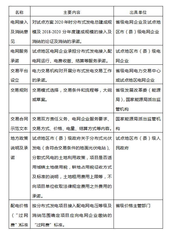 省級發(fā)展改革委(能源局)、價(jià)格主管部門組織編制分布式發(fā)電交易試點(diǎn)地區(qū)市(縣)級區(qū)域試點(diǎn)方案,會同國家能源局派出監(jiān)管機(jī)構(gòu)初步論證后,報(bào)送國家發(fā)展改革委、國家能源局,隨方案報(bào)送以下支持性文件: